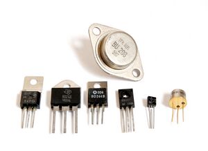 Транзи́стор (англ. transistor, придуманный в 1948 году в США акроним — от англ. transfer + англ. resistor[1] — для изобретённого в 1947 году устройства пропуска тока через сопротивление), полупроводнико́вый трио́д — электронный компонент из полупроводникового материала, способный небольшим входным сигналом управлять значительным током в выходной цепи, что позволяет использовать его для усиления, генерирования, коммутации и преобразования электрических сигналов. В настоящее время транзистор является основой схемотехники подавляющего большинства электронных устройств и интегральных микросхем.