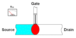 - В полевом транзисторе ток протекает от истока к стоку через канал под затвором. Канал существует в легированном полупроводнике в промежутке между затвором и нелегированной подложкой, в которой нет носителей заряда, и она не может проводить ток. Преимущественно под затвором существует область обеднения, в которой тоже нет носителей заряда благодаря образованию между легированным полупроводником и металлическим затвором контакта Шоттки. Таким образом, ширина канала ограничена пространством между подложкой и областью обеднения. Приложенное к затвору напряжение увеличивает или уменьшает ширину области обеднения и тем самым площадь поперечного сечения канала, управляя током стока и равного ему током истока.