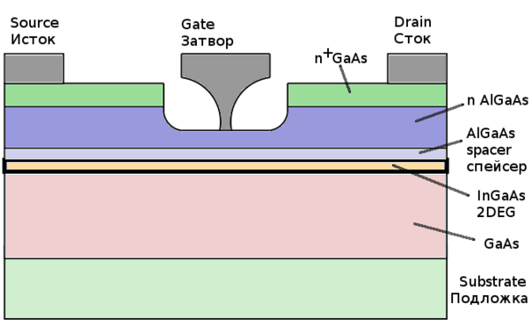 На рисунке представлена структура HEMT-транзистора в разрезе. На полуизолирующей подложке арсенида галлия (GaAs) выращивается нелегированный буферный слой GaAs. На нем наращивается тонкий слой полупроводника с иной шириной запрещенной зоны — InGaAs, такой, что образуется область двумерного электронного газа (2DEG). Сверху слой защищается тонким спейсером на основе арсенида алюминия-галлия AlxGa1−xAs (далее AlGaAs). Выше следуют легированный кремнием слой n-AlGaAs и сильнолегированный слой n+-GaAs под контактными площадками стока и истока. Контакт затвора приближен к области двумерного электронного газа.
