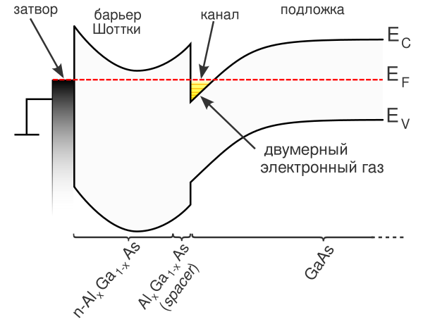 Электроны, образующиеся в тонком слое N-типа, полностью перемещаются в слой GaAs, обедняя слой AlGaAs. Обеднение происходит из-за изгиба потенциального рельефа в гетеропереходе — между полупроводниками с разной шириной запрещенной зоны образуется квантовая яма. Таким образом, электроны способны быстро передвигаться без столкновений с примесями в нелегированном слое GaAs. Образуется очень тонкая прослойка с большой концентрацией высокоподвижных электронов, обладающих свойствами двумерного электронного газа (ДЭГ). Сопротивление канала очень низкое, и подвижность носителей в нём высока.