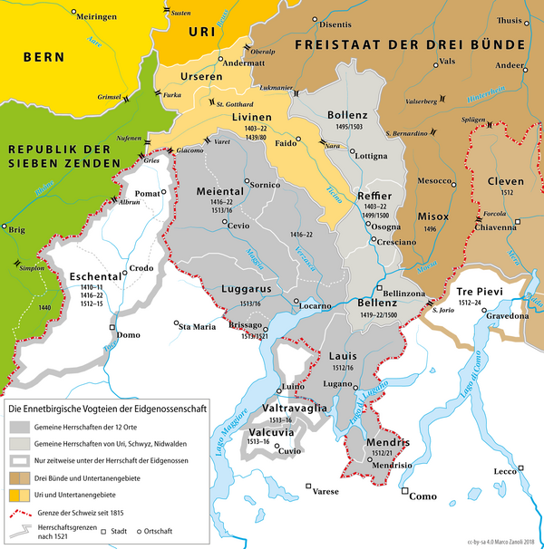 После начала итальянских войн Беллинцона была окончательно оккупирована Ури в 1500 году, официальная её передача конфедерации была произведена французским королем Людовиком XII через три года. Битва при Новаре позволила конфедерация и союзным ей Трём лигам сохранить за собой города Локарно, Лугано, Мендризио, Кувио, Травалья, Кьявенна, Бормио, Тре пьеви и Вальтеллина. Поражение в битве при Мариньяно положило конец стремлениям Швейцарии расширить свои владения, но будущий мир позволил им сохранить все свои владения, за исключением возвращённой Милану Оссолы.