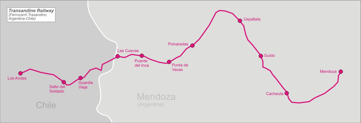 - Аргентинская Трансандинская железная дорога (FCTA): Мендоса — Лас-Куэвас (159 км, пересадка не требовалась);
