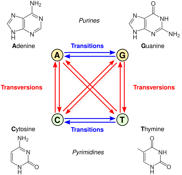 Среди точечных мутаций трансверсии происходят реже, чем транзиции[4]. Так, у человека известно более чем 75 тысячи различных патогенных вариантов, ведущих к наследственным заболеваниям, среди них 20% составляют трансверсии, в то время как на долю транзиций приходится 30%[5].