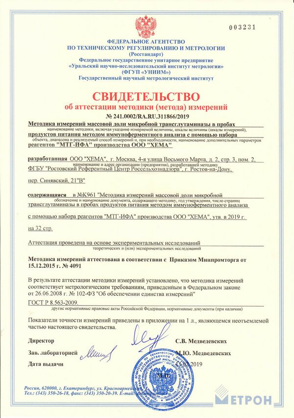 Разработанная и утверждённая методика измерений массовой доли микробной трансглютаминазы в пробах продуктов питания методом иммуноферментного анализа внесена в Федеральный информационный фонд по обеспечению единства измерений (номер ФР.1.31.2019.33721). О нюансах внедрениях и практической реализации методики было рассказано на семинаре, который прошёл в апреле в Ростове-на-Дону с участием специалистов ветеринарных лабораторий и референтных центров Россельхознадзора. Внедрение новой методики в ветеринарных лабораториях и референтных центрах Россельхознадзора позволит начать статистическую проверку по применению ТГ.[24] Методика включена в Информационном фонде по обеспечению единства измерений и используется в судебной практике.[25]