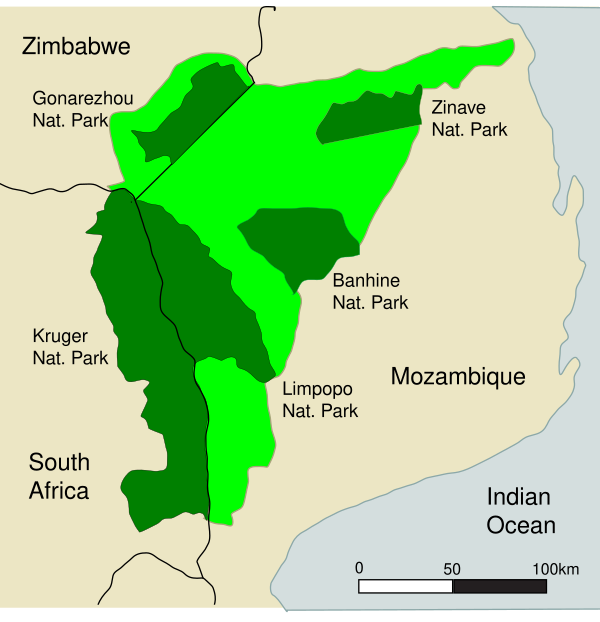 Трансграничный парк Большой Лимпопо включает в себя частные и государственные территории ЮАР, Мозамбика и Зимбабве, а также ранее созданные природные парки и заповедники: