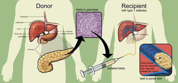 Островки Лангерганса, как правило, вводятся вливанием (инфузией) в печень пациента.[1] Если клетки берутся не от генетически идентичного донора, тело пациента воспринимает их как чужеродные и иммунная система начинает атаковать их, как и в случае любого отторжения трансплантата. Чтобы предотвратить это, используются иммунодепрессанты. Недавние исследования показали, что трансплантация островковых клеток развилась до такой степени, что 58 % пациентов в одном исследовании были инсулиннезависимы через год после операции.[2]