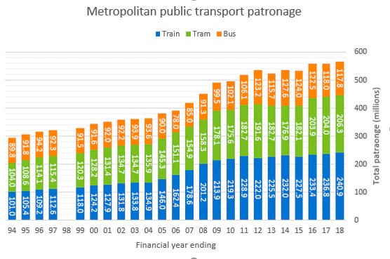 Проведённый в 2009 году анализ пространственного синтаксиса трамвайной и железнодорожной сети Мельбурна показал, что только 8,8 процента жителей столичного региона тратили на поездку в пределах района 30 минут, и только 10-15 процентов могли своевременно получить доступ к соответствующему виду общественного транспорта. Система общественного транспорта Мельбурна обслуживала лишь семь процентов от всех поездок в пределах столичного региона[31]; эта цифра увеличилась до девяти процентов в начале 2009 года, а доля пассажиро-километров увеличилась до 11 процентов.