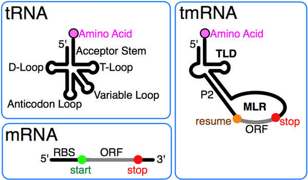 Анализ многочисленных бактериальных геномных последовательностей показал, что тмРНК и транс-трансляция есть в каждой бактериальной клетке. Область тмРНК, соответствующая тРНК, имеет консервативную последовательность, в отличие от остальной части молекулы. Последовательность пептида-метки и его длина не очень консервативны, однако четыре последних его аминокислотных остатка очень консервативны и образуют последовательность ALAA. Именно она является мишенью периплазматической протеазы и цитоплазматических АТФ-зависимых протеаз, которые разрушают дефектные полипептиды[5]. Любопытно, что комплекс из тмРНК Mycobacterium tuberculosis и SmpB E. coli нефункционален, а комплекс из тмРНК E. coli и SmpB M. tuberculosis успешно работает[21].