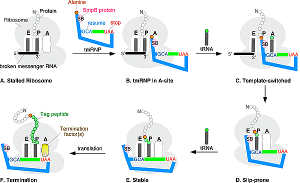 Остановка рибосом на мРНК может происходить при отсутствии в ней стоп-кодона, при наличии в ней группы кодонов, для которых в клетке нет аминоацилированных тРНК, а также в тех случаях, когда мРНК образует стабильную трёхмерную структуру, мешающую продвижению рибосомы. Впрочем, отмечается, что некоторые мРНК подвергаются транс-трансляции существенно чаще, чем другие, причём у разных видов бактерий активной транс-трансляции подвергаются разные мРНК. После доставки комплекса тмРНК с SmpB происходит гидролиз ГТФ до ГДФ, вызывающий конформационные перестройки, благодаря которым EF-Tu в комплексе с ГДФ покидают рибосому, а несущий аланин тРНК-подобный домен, связанный с SmpB, оказывается в А-сайте. В ходе этого процесса С-концевой хвост SmpB взаимодействует с каналом для мРНК, расположенным за А-сайтом. Если в канале есть мРНК, взаимодействие не произойдёт. После этого пептид, синтезированный до остановки рибосомы, переносится на аланиновый остаток тмРНК. Образовавшийся комплекс из пептида, тРНК-подобного домена и SmpB перемещается из А-сайта в Р-сайт рибосомы, причём для перемещения связь С-концевого хвоста SmpB с каналом для мРНК должна разорваться. Далее происходит конформационная перестройка С-концевого хвоста SmpB, благодаря которой может начаться трансляция тмРНК[5]. Иными словами, вместо проблемной мРНК рибосома начинает транслировать открытую рамку считывания в тмРНК. При первой транслокации рибосомы мРНК при содействии фактора EF-G покидает рибосому, и её разрушают специфические РНКазы. Синтез белка, при котором последовательно используются две кодирующие РНК, называется транс-трансляцией. Когда рибосома завершает трансляцию тмРНК, образуется химерный пептид, C-конец которого считан с тмРНК. Он играет роль метки, распознаваемой бактериальными системами протеолиза, которые разрушают дефектный пептид[20].