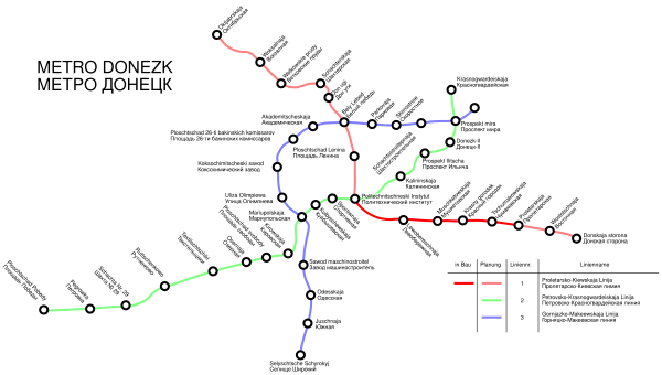 Предполагалось, что первой веткой метро будет «Пролетарско-Киевская», состоящая из 10 км железнодорожного полотна и коммуникаций (4 км из которых на поверхности, 6 км — под землёй), шести станций, депо и инженерного корпуса. По самым амбициозным проектам планировалось три отдельные линии и более 30 станций: «Пролетарско-Киевская» линия (длина 21 км, 2 электродепо), «Петровско-Красногвардейская» (длина 25 км.), «Горняцко-Макеевская» линия (длина 20 км). Две последние с заходом в город Макеевка.