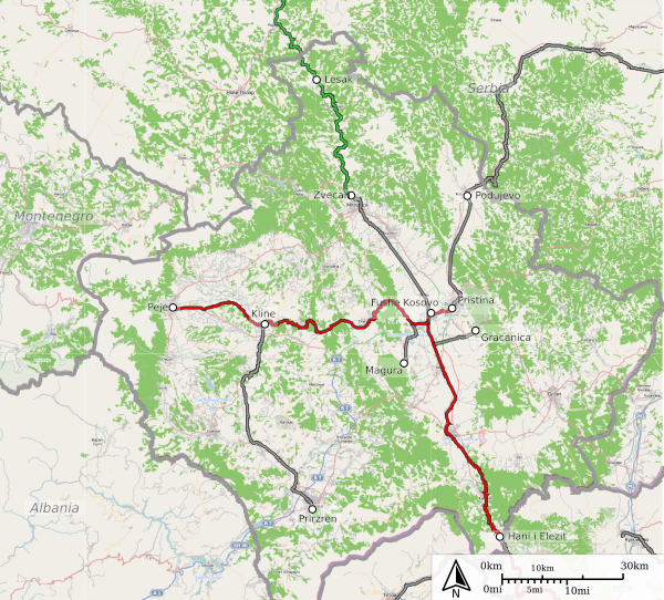 Первая железнодорожная линия на территории Косова была построена под турецким руководством для Compagnie des Chemins de Fer Orientaux. Железная дорога начиналась в Салониках, шла на север в Скопье и достигла Косовской-Митровицы в 1873 году. До Первой мировой войны она использовалась Сербскими железными дорогами, которые действовали как Югославские железные дороги в период с 1918 по 1992 год, и прекратили свою деятельность в Косове после вмешательства НАТО в 1999 году. В 2008 году Сербские железные дороги были восстановили некоторые свои маршруты на севере региона Косова.