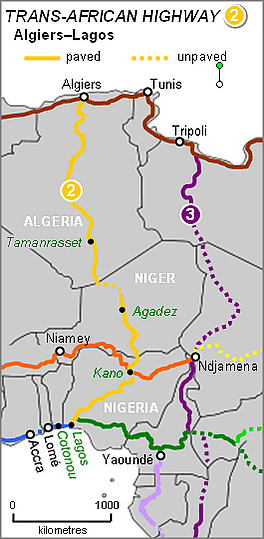 Транссахарское шоссе имеет длину около 4500 км, из которых более 85 % имеют твердое покрытие. Оно проходит через всего лишь три государства — Алжир, Нигер и Нигерию. Также шоссе имеет 3600 км ответвлений в Тунис, Мали и Чад.