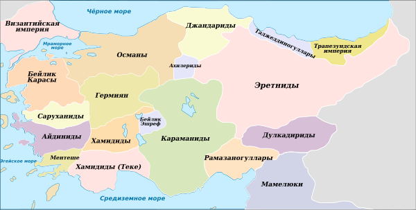 - 1302 год: Гиресунская битва, туркмены отброшены от Гиресун, но все земли к западу от него, за исключением крепости Лимния в устье реки Ирис (Ешильырмак) и крепости Унье, утрачены; империя сокращается практически вдвое[4].