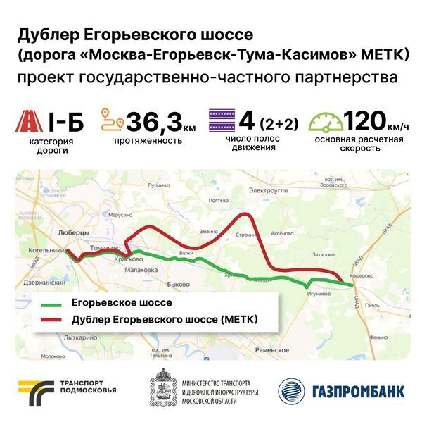 Проект строительства дублёра Егорьевского шоссе в Подмосковье, который будет реализован в период с 2025 по 2028 год, оценён в 110 млрд рублей[12]. Объём финансирования вырос с изначально предполагавшихся 60 млрд рублей, соглашение о концессии было заключено в конце 2021 года. Финансирование осуществляется за счёт гранта от Московской области и банковских кредитов. Исполнительный вице-президент Газпромбанка Светлана Ляпина сообщила, что банк готов предоставить до 80 млрд рублей[8].