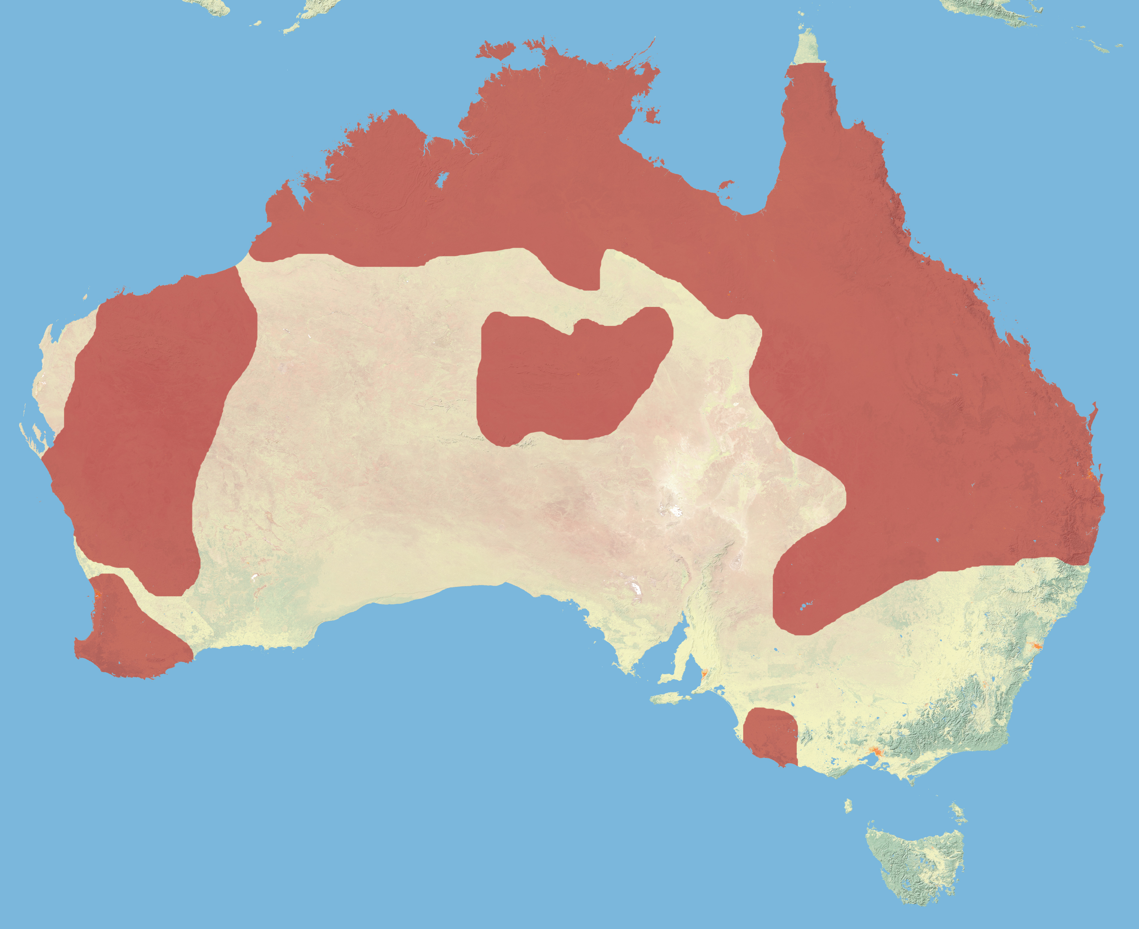 Область распространения включает в себя несколько изолированных участков во всех климатических поясах Австралии[16]. Подвид C. b. macrorhynchus обычен и и многочисленен в Кимберли и в тропической части Северной территории. К югу от залива Карпентария ареал этой расы пересекается с ареалом номинативного подвида C. b. banksii, который также распространён на возвышенностях в центральной части Квинсленда[17]. На северо-востоке материка какаду крайне редок[18], а в районе Брисбена, где он ранее встречался, его уже нет[19]. Подвид C. b. samueli населяет несколько внутренних районов континента: на западе между областью Пилбара и северной окраиной так называемого «пшеничного пояса», в долинах нескольких рек в центральной Австралии, на юго-западе Квинсленда, и в верховьях реки Дарлинг в Новом Южном Уэльсе[20]. С появлением европейцев область распространения какаду во внутренних пустынных и полупустынных районах расширилась за счёт появления артезианских скважин и интродукции травянистого растения Emex australis, чьи плоды стали важным источником питания [21]. Подвид C. b. naso — один из наиболее уязвимых, его область распространения — эвкалиптовые леса в юго-западном углу Австралии в промежутке между городами Гингин и Албани[22]. Наконец, подвид C. b. graptogyne обитает на крохотной территории в юго-западном углу Виктории и прилегающей к ней территории Южной Австралии[22][23].