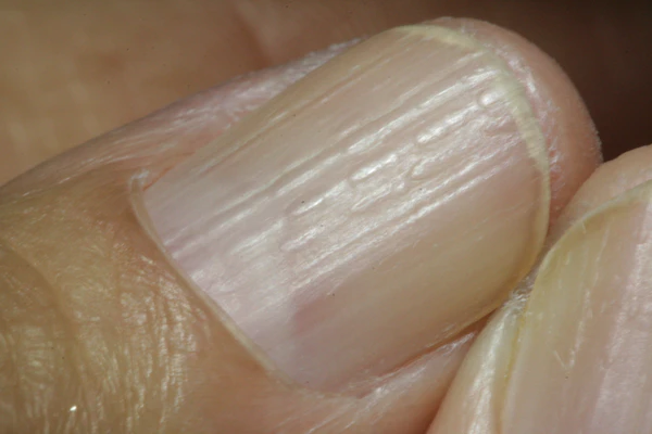 - Дерматоскопия — выявляются продольные борозды, ямочки, шелушение, онихошизия, гиперкератоз кутикулы, поражение проксимальной части ногтевой пластины. Может выявляться истончение ногтевой пластины[6].