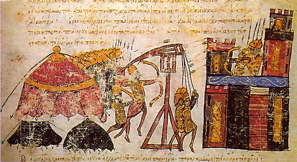 Византийцев, к тому времени уже имевших на вооружении баллисты (скорее всего — уже станковые арбалеты, а не средневековые торсионные машины) и камнемёты-онагры, удивило простое, но достаточно эффективное метательное оружие варваров, которое, видимо, и было заимствовано ими. Существует и другая гипотеза, объясняющее появление тяговых требюше китайского типа в Византии трансляцией через оседлые цивилизации Средней Азии, в пользу чего говорят изображения из дворца в Пенджикенте (VII—VIII века н. э.), машины на которых практически аналогичны китайским. Вероятно даже и обратное направление заимствования — аварами и славянами у византийцев, к примеру, перебежчиков, о чём упоминает современник императора Маврикия (конец VI века н. э.) историк Феофилакт Симокатта.