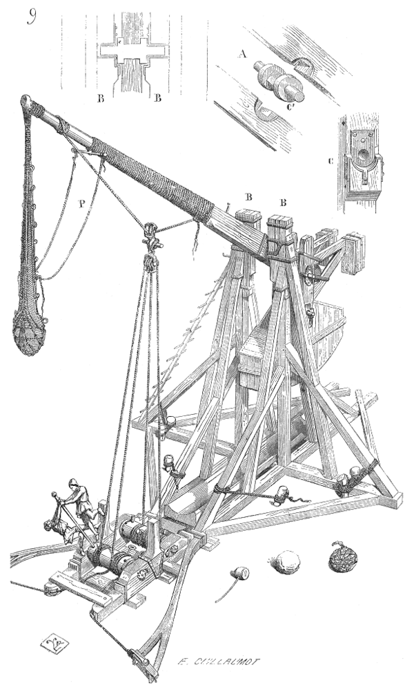 Они были четырёхугольными, широкими в основании и суживающимися к верхушке, на которой имелись очень массивные цилиндры, окованные по краям железом, к которым были пригвождены бревна, подобные балкам большого дома, имевшие подвешенные сзади пращи, а спереди — прочные канаты, с помощью которых, натянув их разом по сигналу книзу, запускали пращи… А четырёхугольные камнемёты они оградили досками только с трёх сторон, чтобы те, кто находился внутри, не были ранены стрелами со стены.[8]