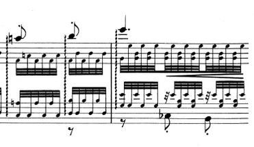 - Немерное тремоло, относящееся к одной ноте, означает, что нота должна исполняться максимально быстро; обозначается тремя чертами через штиль и аббревиатурой «трем.» над нотой. Если знак ставится над нотой, соединённой с другой лигой, лига считается одной из черт тремоло. Такой вид чаще встречается в музыке для струнных, ударных и инструментов с грифом.[7]