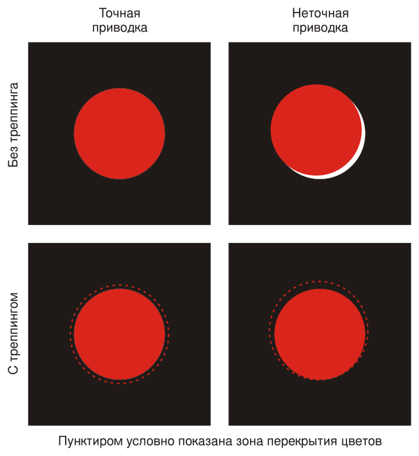 Применение треппинга в полиграфическом процессе обусловлено просвечиванием белой бумаги в местах неточной приводки, что может быть следствием деформации бумаги в печатном станке, смещения плёнок или типографских печатных форм и т. п., что особенно заметно, когда на цветном фоне печатаются цветные линии и буквы — между двумя формами одного цвета возникают зазоры в виде белых полос. При печати полутоновых цветных изображений треппинг применяется крайне редко из-за возможного нарушения цветового баланса и распределения тонов.
