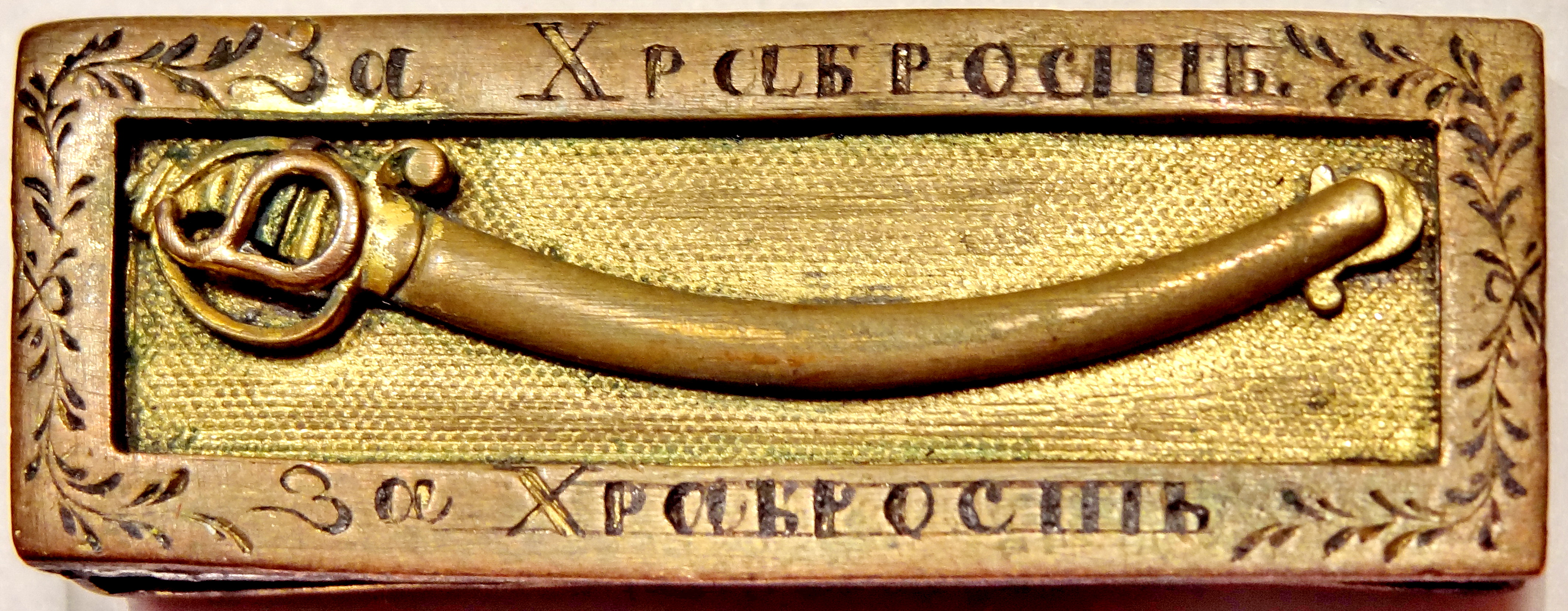 В награду за отличное мужество и храбрость, оказанныя в сражении против французских войск 25 октября под Данцигом.