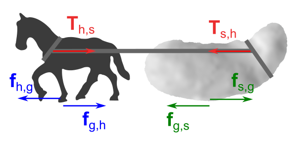 Пусть лошадь запряжена в телегу, и тянет её с некоторой силой вперёд. Но согласно 3-му закону Ньютона, существует сила противодействия, равная ей по величине и направленная назад. Поскольку в сумме обе силы дают ноль, телега никогда не сможет сдвинуться с места.