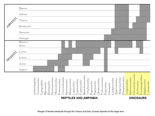 Целый класс конодонтов[1], составлявших 20 % от всех морских семейств, все широко распространённые круротарзы (нединозавроподобные архозавры), некоторые из остававшихся терапсид и многие виды из широко распространённой группы земноводных полностью исчезли. По меньшей мере половина известных сейчас видов, живших на Земле в то время, вымерли. Это событие освободило экологические ниши, позволив динозаврам доминировать начиная с юрского периода. Триасовое вымирание произошло менее чем за 10 000 лет и происходило непосредственно перед тем, как Пангея начала распадаться на части.
