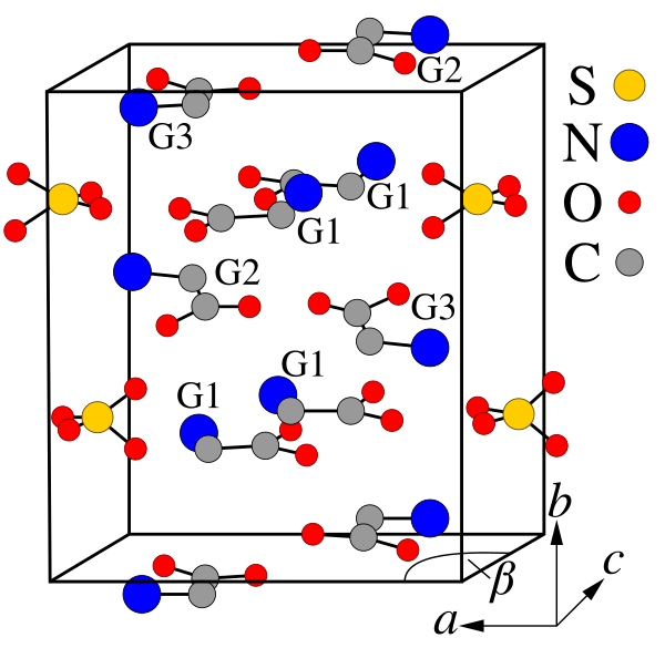 Кристалл состоит из сульфат-ионов , 2-х протонированных глицин-ионов и самопротонированных молекул .
