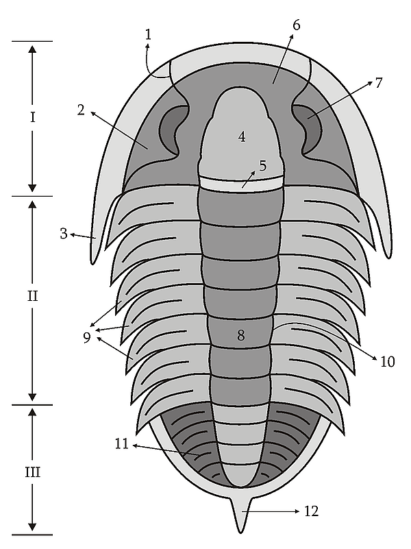 Туловище распадается на среднюю, или осевую, часть (аксиальную долю) и боковые части (плевры), тогда как на хвостовом щите как на продолжении 3 соответствующих частей туловища отличают осевую лопасть и боковые лопасти. Осевые части туловища и хвостового щита в окаменелом состоянии открыты снизу, так как они были прикрыты при жизни тонкой кожицей, но у боковых частей сохранился твёрдый заворот, отличающийся обыкновенно особыми украшающими его линиями.