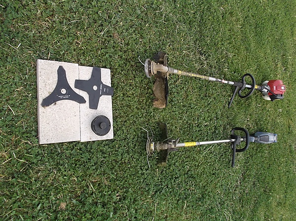 С одной стороны головки расположен защитный кожух, защищающий оператора, а сам вращающийся узел выполняет функцию крепления лески. К недостаткам бензиновых моделей относится большой вес, необходимость дозаправки и высокая вибрация, которая снижает манёвренность и вызывает усталость. Преимуществами являются независимость от источника энергии и большая мощность.
