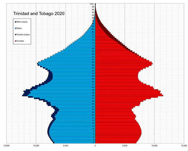 Большинство (96 %) из 1,065 млн жителей (на 2006 год[14]) Тринидада и Тобаго проживает на острове Тринидад. Почти все из остальных 4 % живут на острове Тобаго. В течение XX века население страны неизменно росло, однако на настоящий момент наблюдается снижение численности населения на 0,87 % в год. Это объясняется не столько низкой рождаемостью, сколько высоким уровнем эмиграции[14].