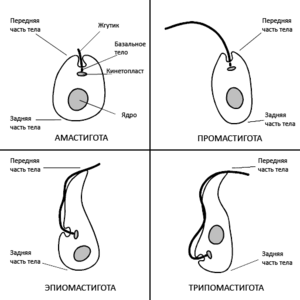 - амастиготная форма — (бывшая лейшманиальная) овальная или круглая, обычно встречается без жгутика.