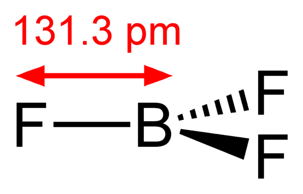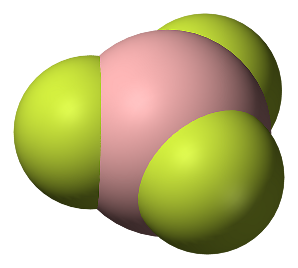 Трифторид бора BF3 при стандартных условиях представляет собой бесцветный токсичный газ с удушливым запахом, дымящий во влажном воздухе[4]. Образует аддукты со спиртами, простыми эфирами, альдегидами, кетонами, органическими основаниями, неорганическими и органическими кислотами. Трифторид бора реагирует с водой. Имеются также данные о том, что данное вещество может растворяться в ней (332,1 г в 100 г Н2О при 0 °C, 772 МПа, с частичным гидролизом), водных растворах HF, многих органических растворителях. При температуре выше +20 °C образует неустойчивые моногидрат и дигидрат[4].