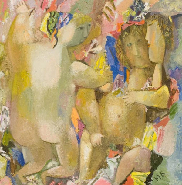 На картине изображены три девушки в полный рост. Слева представлена полная обнажённая фигура со спины: на голове повязан разноцветный платок, из-под которого выбивается кудрявая светлая челка; лицо обращено вправо, ноги согнуты в коленях, руки подняты вверх и вытянуты перед собой. У правого края композиции, боком к зрителю, сидит худощавая девушка с короткими тёмными волосами: левая рука вытянута вперёд, на теле угадывается разноцветная безрукавная одежда, лицо вытянуто, глаза закрыты. Позади неё, лицом к зрителю, расположена полная девушка с русыми волосами, на голове которой завязаны красные бантики. На лицевой стороне в правом нижнем углу нанесены инициалы «м. б.». На обороте холста в правом верхнем углу указано «г. Екатеринбург Брусиловски М.Ш. к.м. 85×84 2012 г.».
