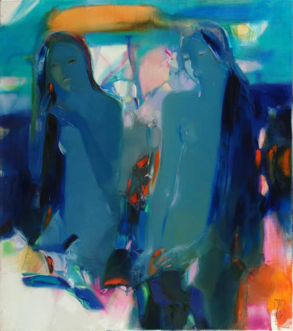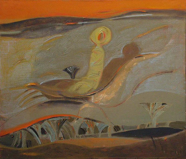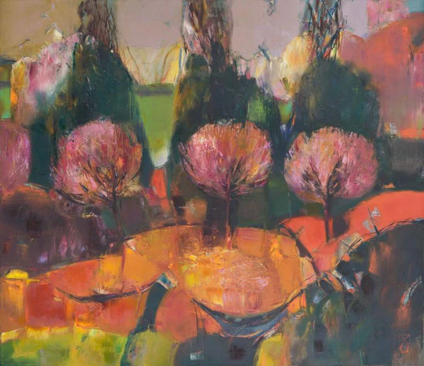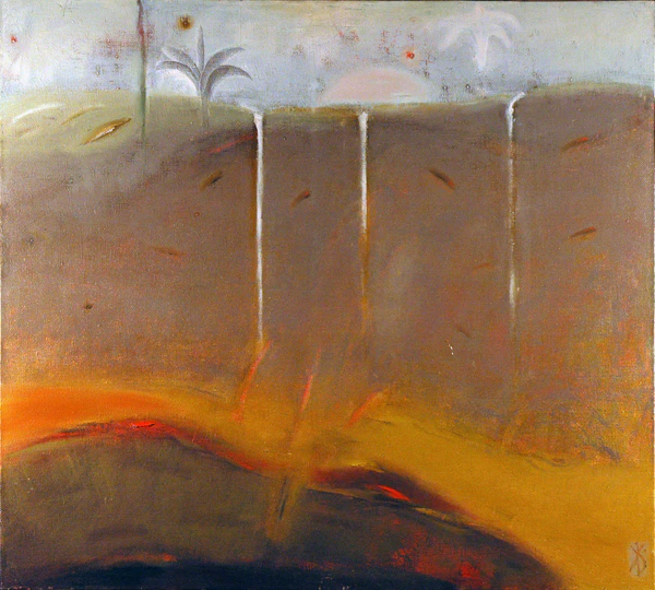 В центре композиции изображены три источника, падающих вниз с высоты. Композиция символична и изящна за счёт тонко звучащей цветовой гаммы. Тяжёлый плотный тон в нижней части композиции постепенно облегчается кверху.
