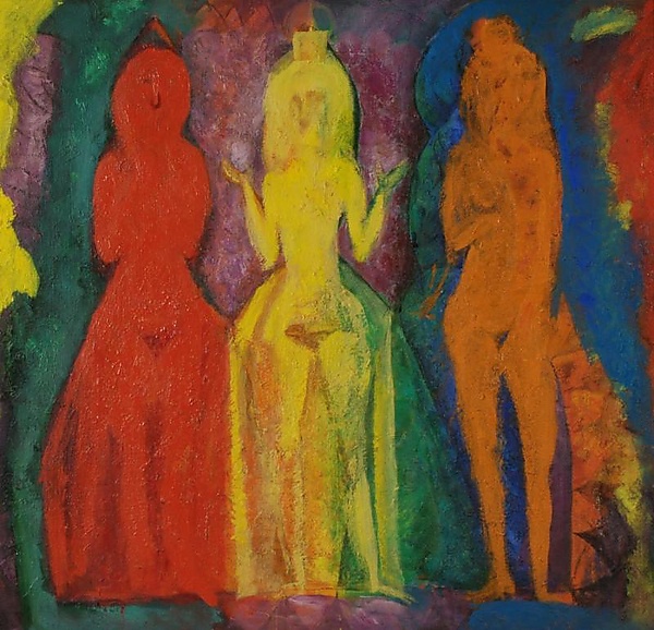 На абстрактном цветном фоне фронтально размещены три обобщённые женские фигуры, выполненные в красном, жёлтом и оранжевом цветах. Жёлтая фигура выделяется поднятыми вверх руками, что придаёт дополнительную выразительность композиции.
