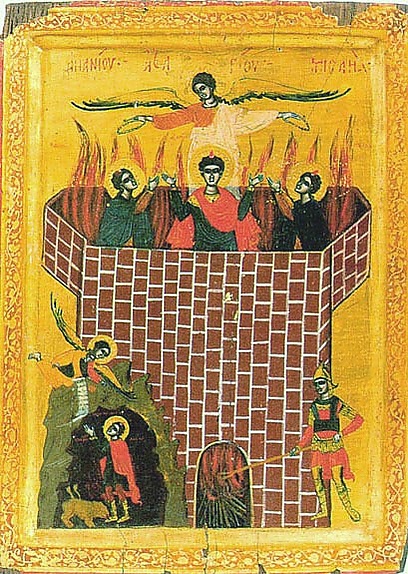 И как повеление царя было строго, и печь раскалена была чрезвычайно, то пламя огня убило тех людей, которые бросали Седраха, Мисаха и Авденаго. А сии три мужа, Седрах, Мисах и Авденаго, упали в раскалённую огнём печь связанные. [И ходили посреди пламени, воспевая Бога и благословляя Господа. И став Азария молился и, открыв уста свои среди огня, возгласил: «Благословен Ты, Господи Боже отцов наших, хвально и прославлено имя Твоё вовеки<…>».