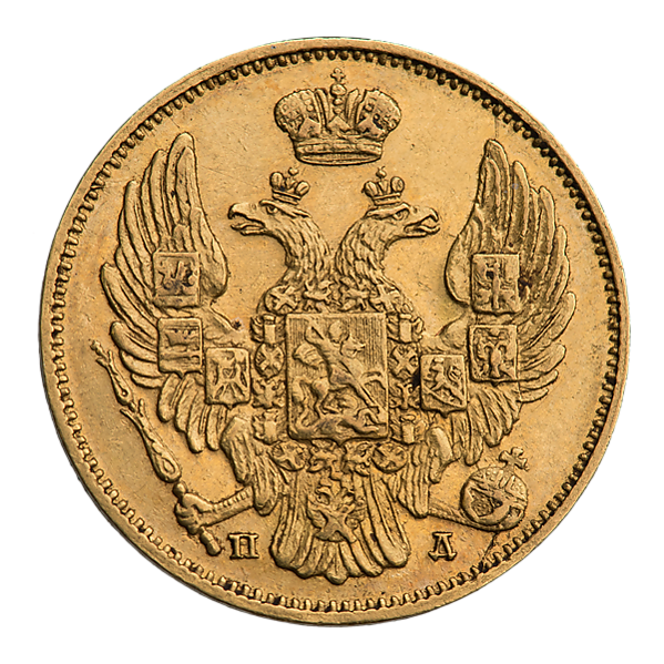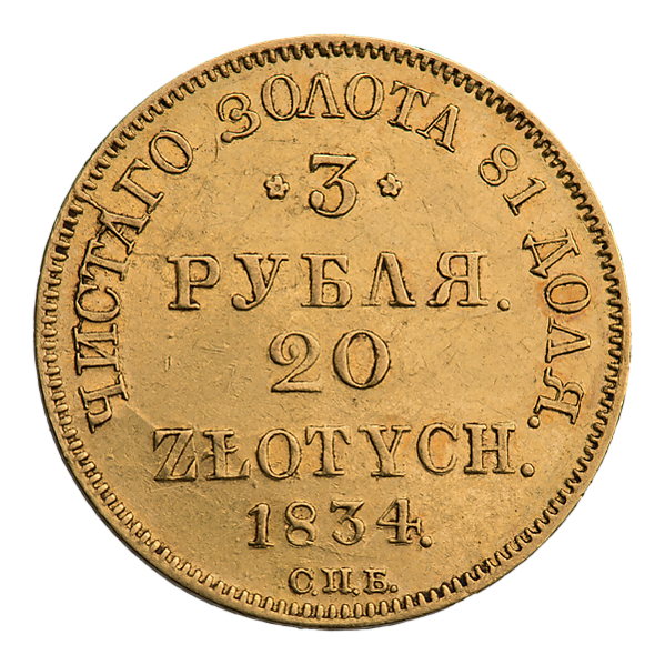 Во времена правления Николая I три рубля чеканились из золота 917 пробы, их диаметр составляет 22,8, мм, а вес равен 3,92 г, чистого золота 3,60 г. Были выпущены в Варшавском монетном дворе в количестве 77 106 экземпляров. Гурт является рубчатым[1][2][3][4][5].