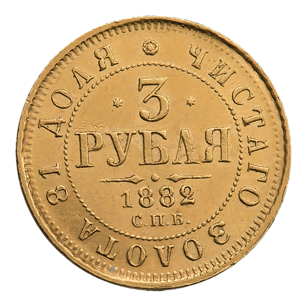 Во времена правления Александра III три рубля чеканились из золота 917 пробы, их диаметр составляет 19,7 мм, а вес равен 3,93 г, чистого золота 3,6 г. Были выпущены в Санкт-Петербургском монетном дворе в количестве 6 экземпляров. Гурт является пунктирным[12][13][6][7].