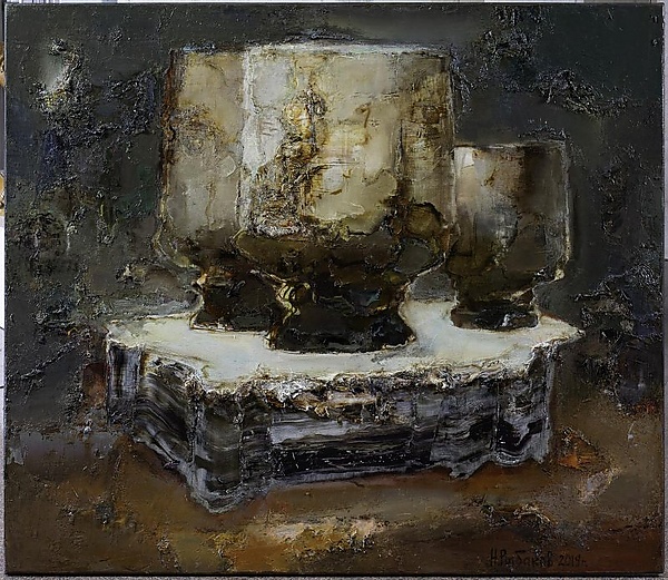 В центре композиции на подставке располагаются три чаши: две одинакового размера стоят рядом, а правее помещена чаша меньшего размера. Работа выполнена в жанре натюрморта с акцентом на живописную поверхность, отличающуюся ложной фактурой и выразительным колоритом.