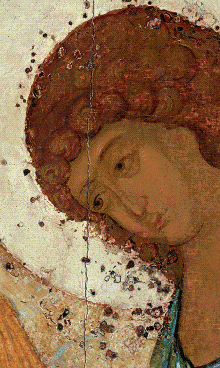 - Следующее, скорее всего, к 1635 году, когда поновлялась вся живопись монументальная и иконостас Троице-Сергиевой Лавры, и учитывая характер поновлений монументальной живописи, мы можем предполагать, что именно в это время икона «Троица» была варварски спемзована и те утраты красочного слоя, которые мы имеем на сегодняшний день, — например, на одеждах ангелов и на фоне, — результат этого поновления.