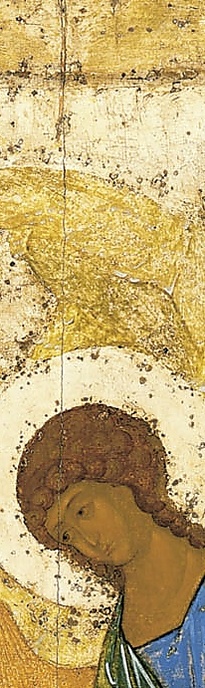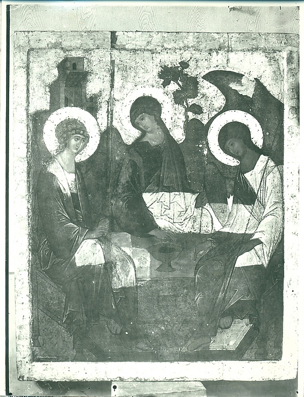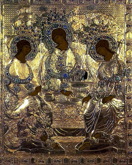 До конца 1904 г. «Троица» Рублёва была спрятана от глаз любопытствующих тяжёлой золотой ризой, оставлявшей открытыми только лики и руки ангелов.