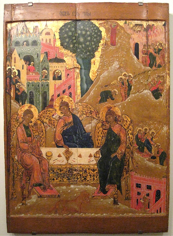 Именно рублёвская икона, как считают учёные, соответствовала этим представлениям. Стремясь раскрыть догматическое учение о Святой Троице, Рублёв отказался от традиционных повествовательных деталей, которые обычно включались в изображения «Гостеприимства Авраама». Нет Авраама, Сарры, сцены заклания тельца, атрибуты трапезы сведены к минимуму: ангелы представлены не вкушающими, а беседующими. «Жесты ангелов, плавные и сдержанные, свидетельствуют о возвышенном характере их беседы»[4]. В иконе всё внимание сосредоточено на безмолвном общении троих ангелов.