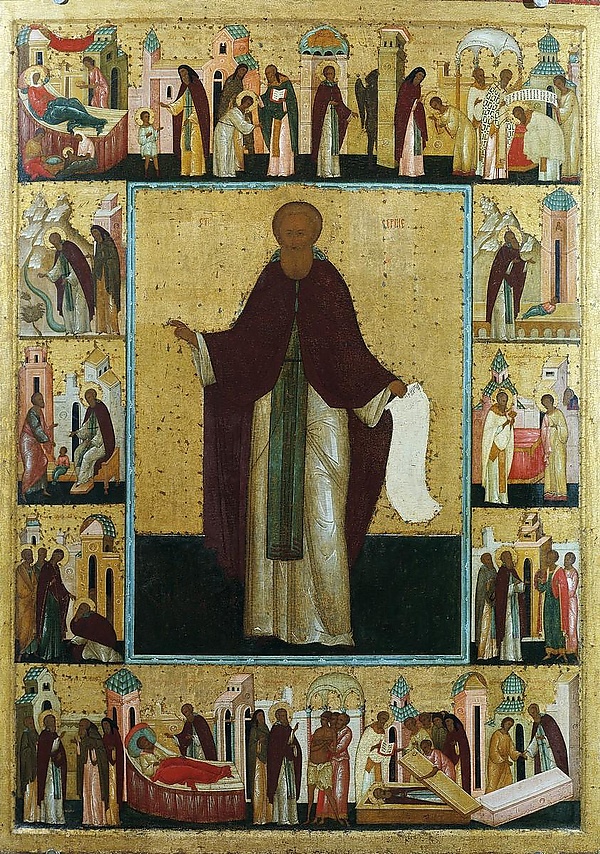По общепринятой в настоящий момент версии, основанной на церковном предании, икона была написана «в похвалу Сергию Радонежскому» по заказу его ученика и преемника игумена Никона[1].