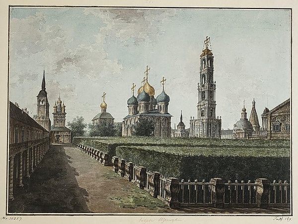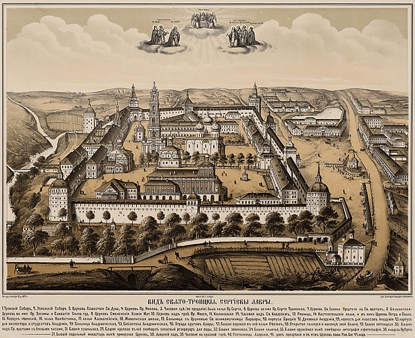 В XVIII—XIX веках Троице-Сергиева лавра стала одним из богатейших монастырей России, входила в число самых крупных землевладельцев (в 1763 году, в преддверии крупной конфискации церковных земель, лавре принадлежало более 100 тысяч душ крестьян)[5]. Активная торговля (зерновыми, солью, предметами быта) способствовала приумножению богатств монастыря; его финансовое положение в XVII—XVIII вв. отличалось большой прочностью; велики были пожертвования монастыря в пользу русской армии (в 1812 году — около 70 тысяч рублей[38]), ополчения (см. Дионисий Радонежский). Значение лавры как культурного центра также возрастало; в 1814 году сюда из Москвы была переведена Духовная академия, расположившаяся в здании Царских чертогов. В связи с размещением академии ряд зданий был перестроен, появились новые постройки, — всё это, по мнению некоторых исследователей, привело к нарушению целостности архитектурного комплекса[39][40].