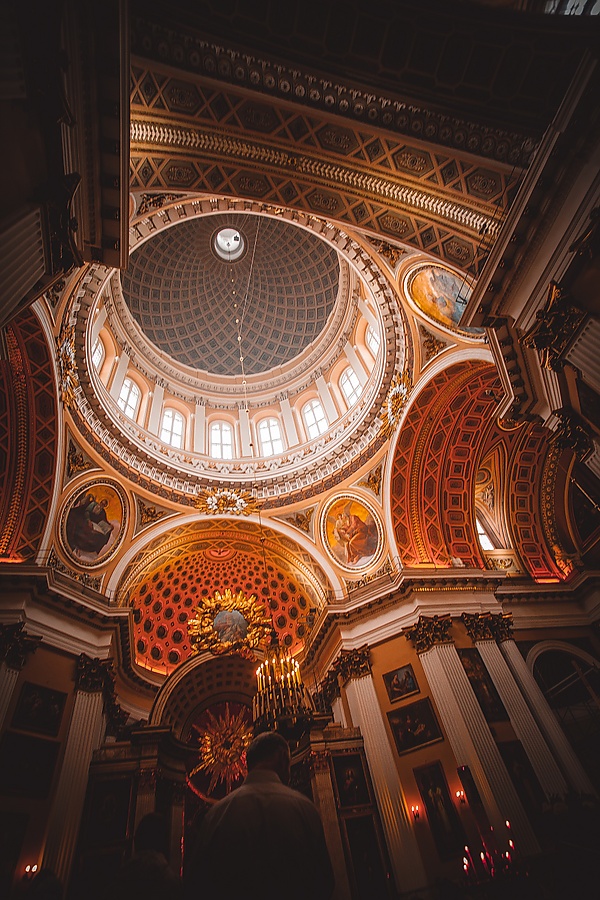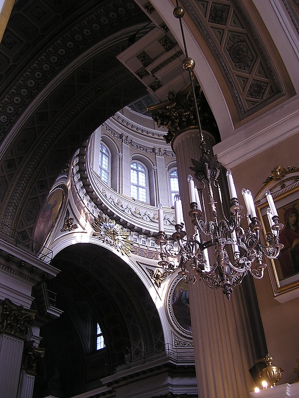 Главный неф декорирован приставными коринфскими колоннами с золочёными капителями. Основное освещение происходит через шестнадцать окон барабана, поддерживающего купол.