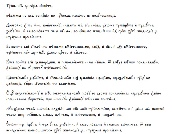 | Глас 3-й: | Чтец: «Тро́ице Единосу́щная и Неразде́льная, Еди́нице Триипоста́сная и Соприсносу́щная, Тебе́, я́ко Бо́гу, А́нгельскую песнь вопие́м» Хор: «Свят, Свят, Свят еси́, Бо́же наш…» |
