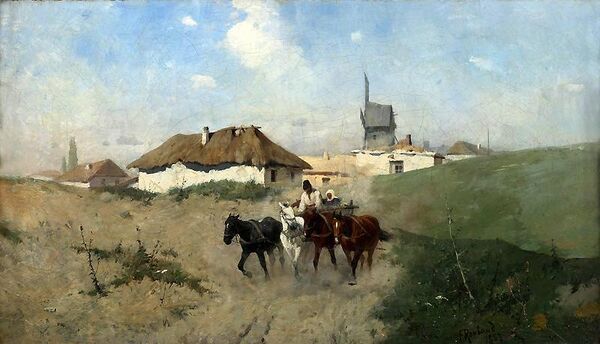 Полотно выполнено в горизонтальной ориентации и отличается многофигурной композицией на фоне пейзажа, выдержанного в серо-бурых и охристых тонах. От переднего плана вглубь картины проходит дорога, по которой в центре среднего плана движется упряжка из трёх лошадей: крайняя слева белой масти, две другие — гнедые. Над коренной лошадью установлена дуга с колокольчиком. В повозке находятся две мужские фигуры, что подчёркивает принадлежность работы к бытовому жанру. Изображение отличается свободной манерой письма, характерной для этюдных работ. Высокая линия горизонта и полоса дыма на фоне яркого неба завершают композицию.