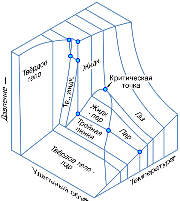 Поскольку координаты тройной точки задаются значениями P и T и не зависят от V, то на трёхмерной фазовой диаграмме P—T—V и её проекции на плоскость P—V равновесным состояниям трёх фаз соответствует тройная линия (triple line)[17][18].