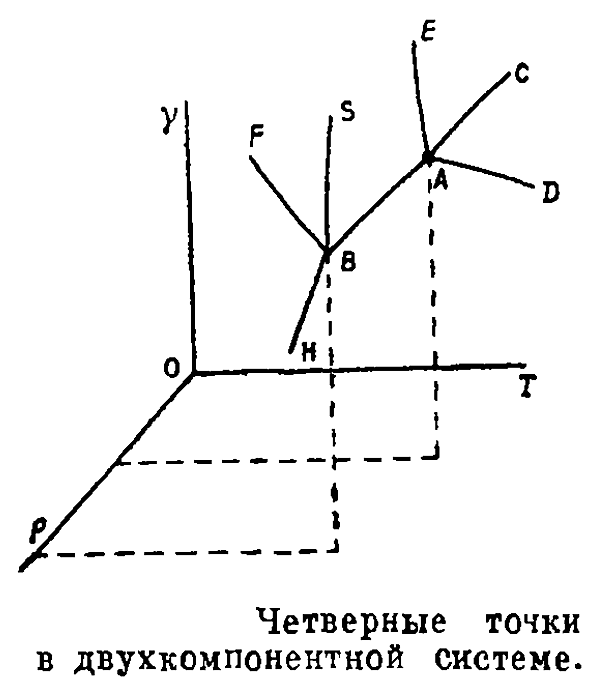При увеличении числа компонентов системы (раствора или сплава) увеличивается и число независимых параметров, характеризующих эту систему. Для описания двухкомпонентной системы к температуре и давлению добавляют третий параметр, характеризующий состав системы. Нонвариантной в бинарной системе будет четверная точка. Например, в системе из воды и соли одновременно в равновесии могут быть фазы: раствор, соль, лёд и пар (точка А на рис. Четверные точки в двухкомпонентной системе). Если соль образует кристаллогидраты, то возможны другие комбинации четырёх фаз, например раствор, соль безводная, твёрдый кристаллогидрат, лёд (или вместо льда пар) и т. д.(точка В на рис. Четверные точки в двухкомпонентной системе)[4][26]. Трёхмерная диаграмма состояния бинарной системы имеет уже множество тройных точек, расположенных на тройной пространственной кривой. На плоской диаграмме равновесие трёх фаз для такой системы можно отобразить, если считать один из параметров постоянным. В общем случае тройные точки существуют на плоских диаграммах состояния систем с любым числом компонентов, если все параметры, определяющие состояние системы, кроме двух, фиксированы[1].